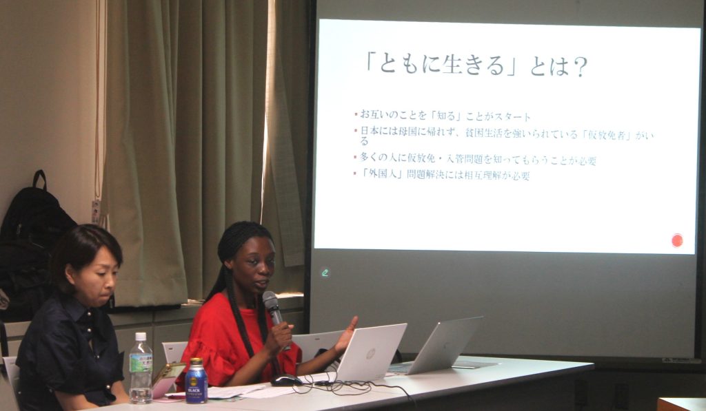 最後に登壇したのは、日本で生まれ育ったガーナ人のクアテンさん。「日本で生まれ育った仮放免者として」というテーマで、自身の経験と仮放免制度の実態について語りました。仮放免者として両親は働くことを認められておらず、経済的に厳しいなかで習い事を諦めたり、友人から譲り受けた服を着て過ごしたといいます。日本で生まれ、日本語を話し、日本の学校に通っていたクアテンさんは、日本にしか生活の基盤がない中で、入管に「日本に残りたい」と手紙を書いたものの、返事はなかったと話しました。「お互いのことを知ることがスタートです」とクアテンさんは語ります。また、多くの人に仮放免制度や入管の問題を知ってもらう必要があるとも訴えました。その言葉は、共生社会をつくる第一歩が「知ること」から始まることを教えてくれました。